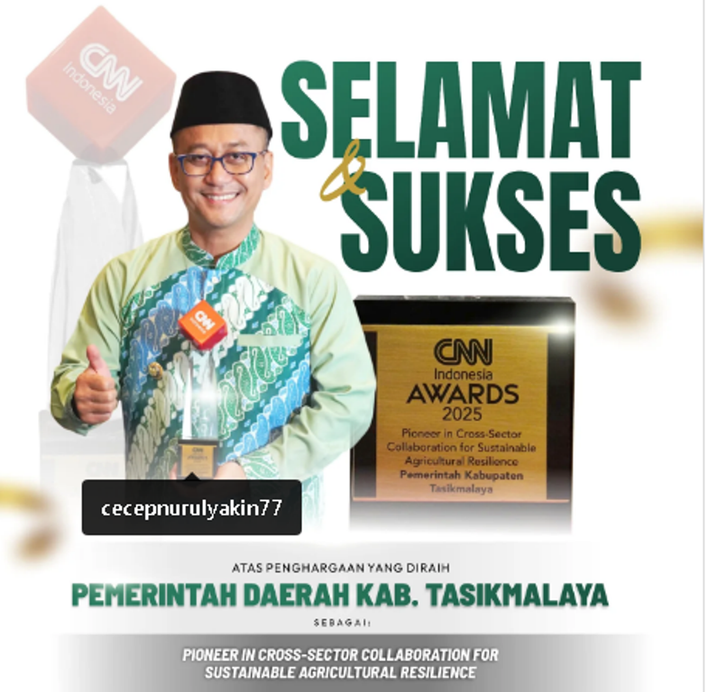 IDERAKYAT.COM — Pemerintah Daerah Kabupaten Tasikmalaya kembali meraih prestasi membanggakan di tingkat nasional. Kabupaten Tasikmalaya dinobatkan sebagai penerima penghargaan “Pioneer in Cross-Sector Collaboration for Sustainable Agricultural Resilience” dalam ajang bergengsi CNN Indonesia Awards 2025.