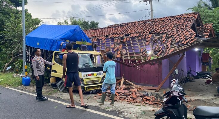 IDERAKYAT.COM — Sebuah rumah di Jalan Raya Cihandura, Kampung Cihanura, Desa Ciheras, Kecamatan Cipatujah, Kabupaten Tasikmalaya, rusak setelah dihantam truk bernomol polisi AA 9037 AJ, Senin 15 Desember 2025.